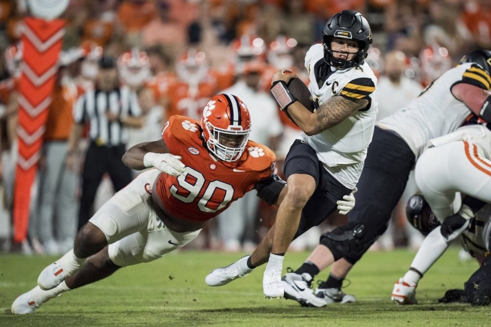 FILE - Clemson defensive tackle Stephiylan Green (90) sacks Appalachian State quarterback Joey Aguilar (4), who recently transferred to Tennessee, in the second half of an NCAA college football game, Sept. 7, 2024, in Clemson, S.C. (AP Photo/Jacob Kupferman, File)