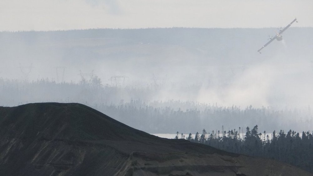 A water bomber flies over a wildfire near St. John's, N.L., on Wednesday, Aug. 13, 2025. THE CANADIAN PRESS/Sarah Smellie