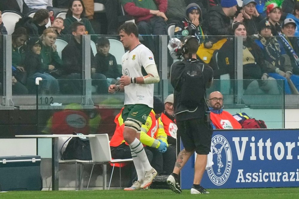 South Africa's Franco Mostert leaves the pitch after getting a red card during the rugby union Nations Series match between Italy and South Africa, in Turin, Italy, Saturday, Nov. 15, 2025. (AP Photo/Luca Bruno)