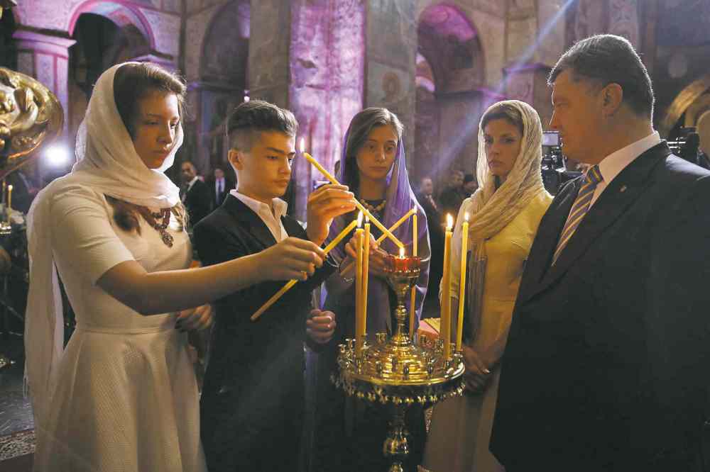 CP From right, Ukrainian President Petro Poroshenko, his wife Maria, daughter Yevheniya, son Mykhailo and daughter Olexandra light candles during a special service in St. Sophia Cathedral in Kiev, Ukraine, Saturday, Aug. 23, 2014. Ukraine is celebrating the Independence Day on Sunday. (AP Photo/Presidential Press Service, Mikhail Palinchak, Pool)