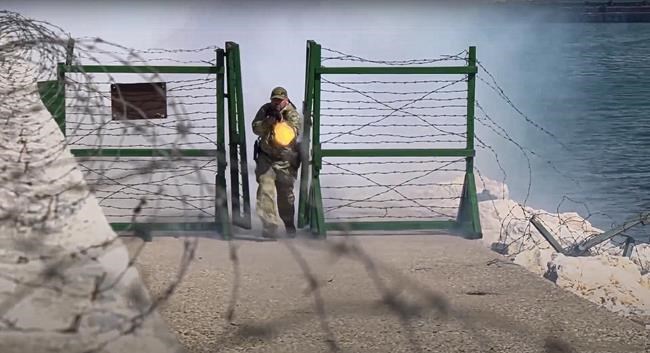 In this photo taken from video provided by the Russian Defense Ministry Press Service on Wednesday, Feb. 16, 2022, a Russian serviceman fires from his weapon during naval exercises at a military base in Syria. Russia's naval drills in the Mediterranean come amid tensions with the West over Ukraine. (Russian Defense Ministry Press Service via AP)