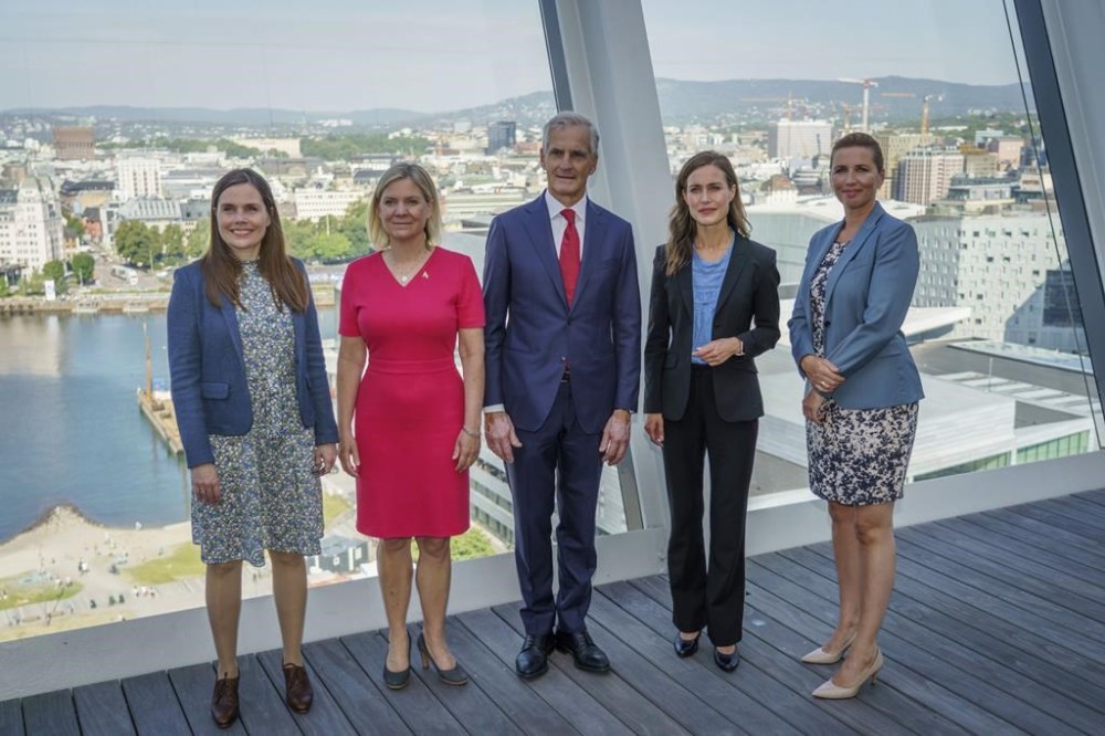 Norway Prime Minister Jonas Gahr Store, centre, poses for a photo with from left, Icelandic Prime Minister Katrin Jakobsdottir, Sweden Prime Minister Magdalena Andersson, Finland Prime Minister Sanna Marin and Denmarke Prime Minister Mette Frederiksen, ahead of a Nordic Prime Ministers' meeting at Munch Museum, in Oslo, Monday, Aug. 15, 2022. (Heiko Junge /NTB Scanpix via AP)