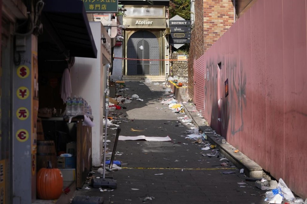 The scene of a deadly accident sits empty following Saturday night's Halloween festivities is seen in Seoul, South Korea, Monday, Oct. 31, 2022. Police are investigating what caused a crowd surge that killed more than 150 people during Halloween festivities in Seoul over the weekend in the country’s worst disasters in years. (AP Photo/Lee Jin-man)