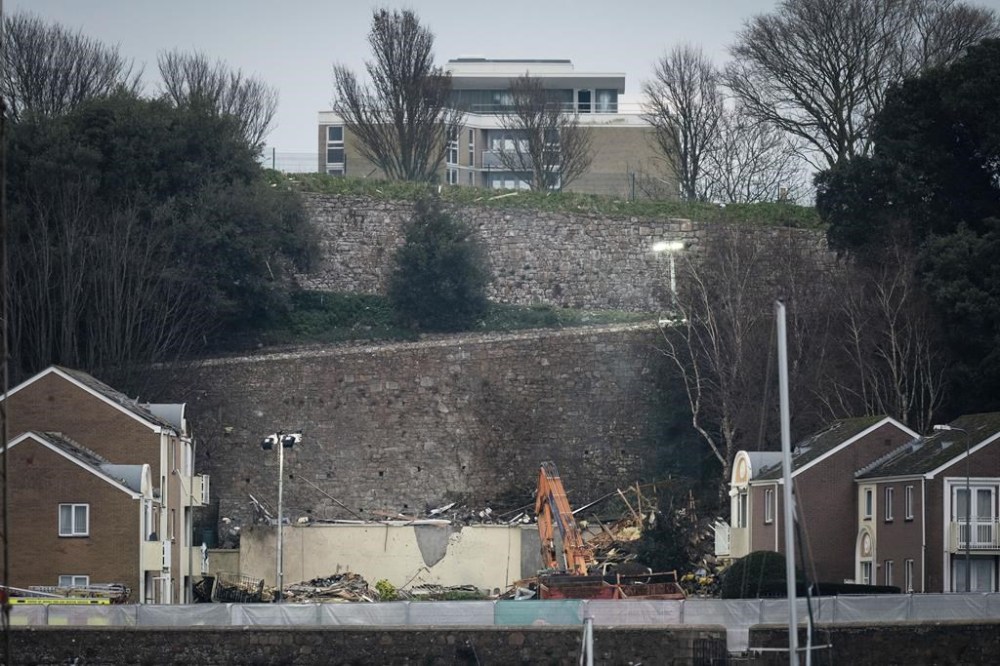 A view of the scene of an explosion and fire at an apartment building, in St Helier, Jersey, Channel Islands, Sunday, Dec. 11, 2022. An explosion and fire in an apartment building has killed at least three people and left several missing. The chief officer of the States of Jersey Police said “around a dozen” residents were missing on Saturday following the blast in the town of St Helier. (Aaron Chown/PA via AP)