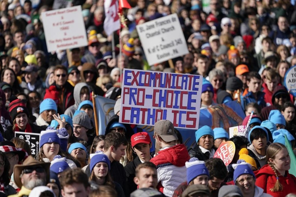 “I am the post-Roe generation,” read one sign. “Excommunicate Pro-Choice Catholics,” said another. Banners proclaimed “Love Them Both,” meaning mother and child.