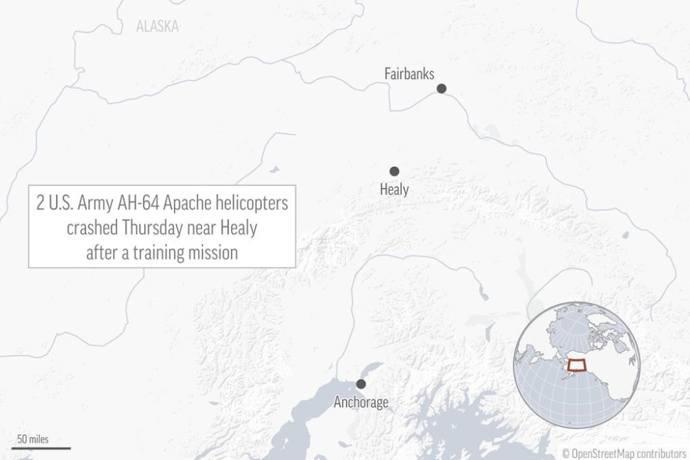 On Thursday, two Army helicopters collided near Healy, Alaska, killing three soldiers and injuring a fourth. The aircraft from the 1st Attack Battalion, 25th Aviation Regiment at Fort Wainwright, near Fairbanks, were returning from training at the time of the crash, according to the Army. The unit is part of the 11th Airborne Division, which is nicknamed the “Arctic Angels.”
