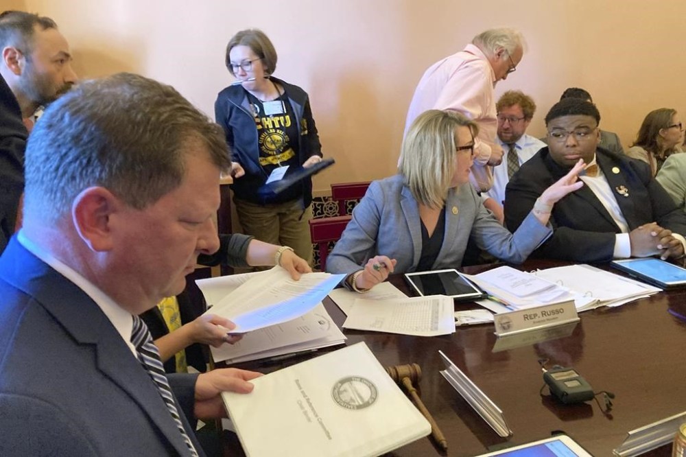 Cries of protest resounded through the Statehouse as Wednesday’s debate took place, and Democratic lawmakers produced hand-painted signs from under their seats just after the vote and exited the chamber chanting, “One person, one vote.”