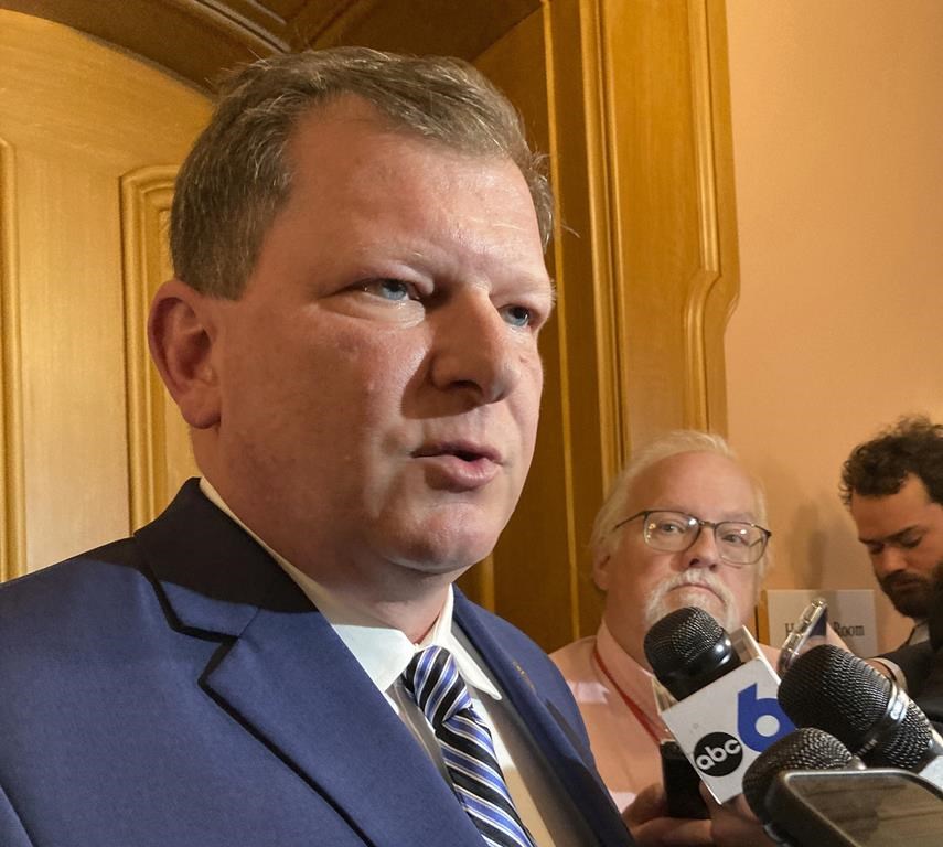Republican Ohio House Speaker Jason Stephens speaks to reporters at the Ohio Statehouse in Columbus, Ohio, after a vote Tuesday, May 9, 2023, to send a proposal that would make it more difficult to amend the state's constitution to a Wednesday floor vote. (AP Photo/Julie Carr Smyth)