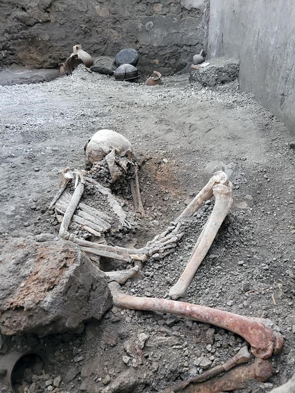 A picture made available Tuesday, May 16, 2023 by the Pompeii Archeological Park press office, showing one of the two discovered skeletons that archeologists believe were men who died when a wall collapsed on them during the powerful earthquakes that accompanied the eruption of Mount Vesuvius that destroyed the ancient city of Pompeii in 79 A.D. The two skeletons were found in the insula of the Casti Amanti, beneath a wall that collapsed before the area was covered in volcanic material. (Pompeii Archeological Park via AP)
