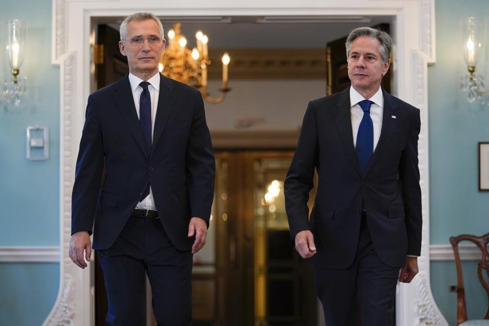 Secretary of State Antony Blinken, right, and NATO Secretary General Jens Stoltenberg arrive to speak at the State Department in Washington, Tuesday, June 13, 2023. (AP Photo/Carolyn Kaster)