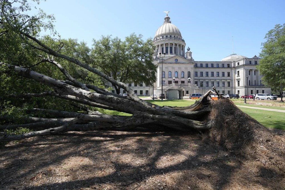 Severe weather that passed through Central Mississippi caused this tree to be uprooted on the State Capitol grounds in Jackson, Miss., Friday, June 16, 2023. A 67-year-old Canton man died after a tree fell on his home as a result of the inclement weather. (AP Photo/Rogelio V. Solis)