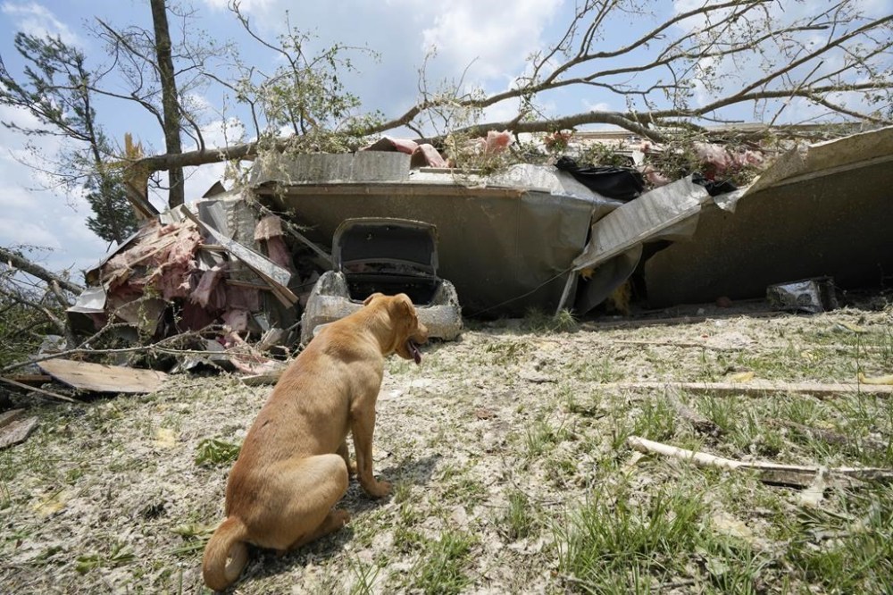 A family dog sits in front of what is left of its home following an apparent Sunday night tornado that swept through the small community of Louin, Miss., on Monday, June 19, 2023. (AP Photo/Rogelio V. Solis)