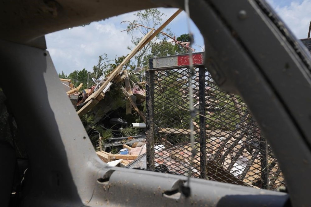 A blown out window of a truck provides a view of the destruction from a Sunday night tornado that swept through Louin, Miss., Monday, June 19, 2023. (AP Photo/Rogelio V. Solis)