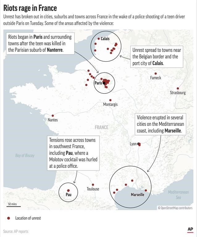 The violence appeared to be lessening. Still, the office of Interior Minister Gerald Darmanin said 45,000 police officers would again be deployed in the streets to counter anger over discrimination against people who trace their roots to former French colonies and live in low-income neighborhoods. Nahel is of Algerian descent and was shot in the Paris suburb of Nanterre.