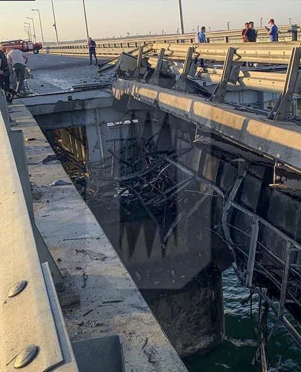 Hours after the attack, video from Russian authorities showed crews picking up debris from the deck of the bridge, a section of which appeared to be sloping to one side, and a damaged black sedan with its passenger door open.