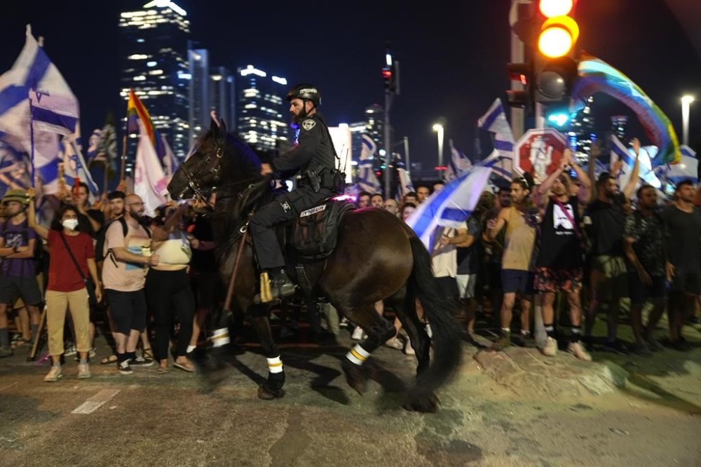 In Tel Aviv, movement leaders staged a “night of resistance,” marching through the city’s streets, beating drums and blaring horns. Police used water cannons and officers on horseback to clear protesters from the Tel Aviv highway, which remained blocked after midnight. Police reported at least six arrests.
