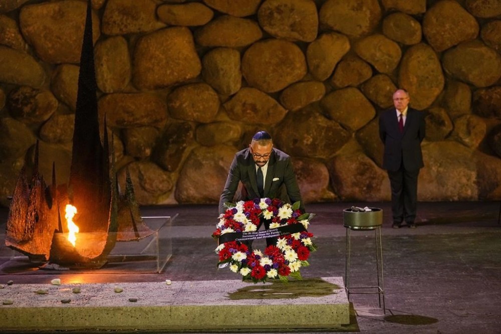 Cleverly toured Yad Vashem, Israel’s official Holocaust memorial in Jerusalem, where he took part in a wreath-laying memorial ceremony. An eternal flame burns by a crypt containing the ashes of Holocaust victims to commemorate the 6 million Jews killed by Nazi Germany and its collaborators during World War II.