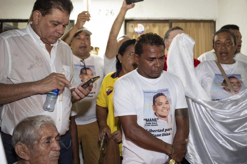 Gabriel Díaz, center, uncle of Liverpool striker, Luis Diaz, and other family members, attend a vigil for the release of the soccer star´s father, in Barrancas, La Guajira department, Colombia, Tuesday, Oct. 31, 2023. The parents of the 26-year-old Diaz were reportedly kidnapped as they drove to their home. Cilenis Marulanda, mother of the Colombian soccer player, was rescued by police in Barrancas, Colombia’s President Gustavo Petro said. (AP Photo/Leo Carrillo)