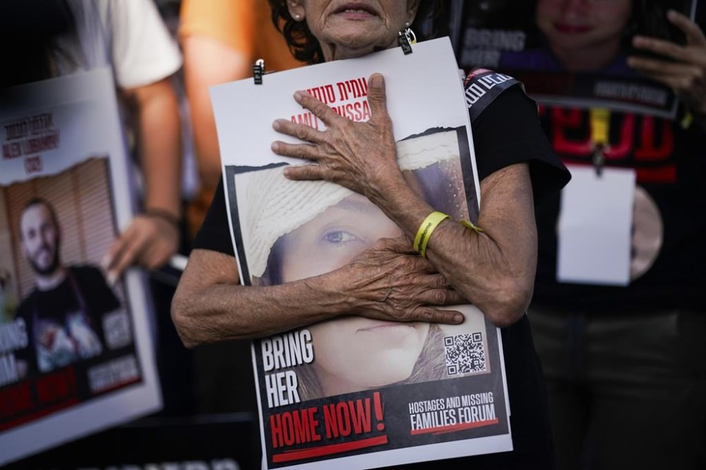 Relatives and friends of those kidnapped during the Oct. 7 Hamas bloody cross-border attack in Israel, hold photos of their loved ones during a protest calling for their return outside the Knesset, Israel's parliament in Jerusalem Monday, Nov. 6, 2023. On Oct. 7, about 240 were taken hostage and 1,400 were killed in the cross-border attack by Hamas militants in Israel. (AP Photo/Leo Correa)