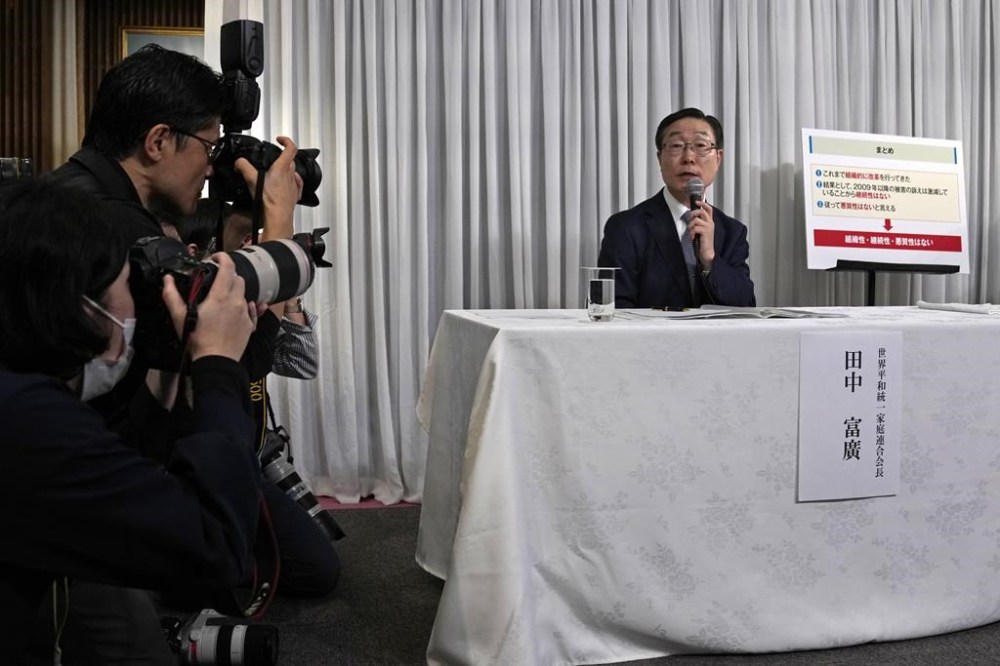 TOKYO (AP) — The Unification Church’s Japanese branch announced plans Tuesday to set aside a fund up to 10 billion yen ($67 million) to cover possible compensation for those seeking damages they say were caused by the group’s manipulative fundraising tactics.