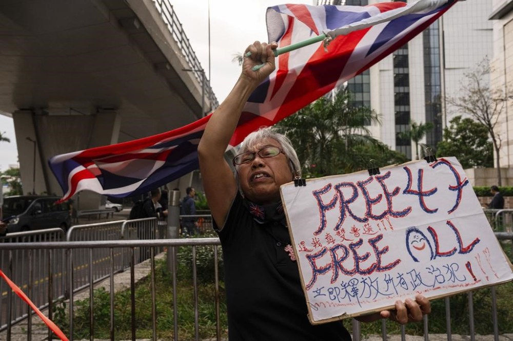 Outside the court, pro-democracy activist Alexandra Wong, popularly known as “Grandma Wong,” held a placard that read “Free 47, Free All” and waved a British flag to show her support to those who went on trial.