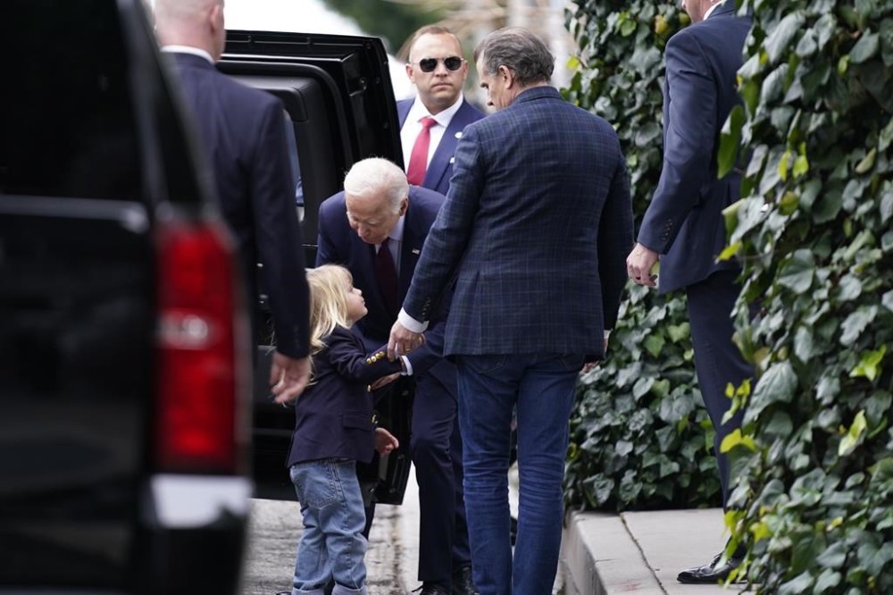 President Joe Biden, center, talks to his grandson Beau, left, as son Hunter Biden, right, looks on after dining at The Ivy in Los Angeles, Sunday, Feb. 4, 2024. Today is Hunter Biden's birthday. (AP Photo/Stephanie Scarbrough)