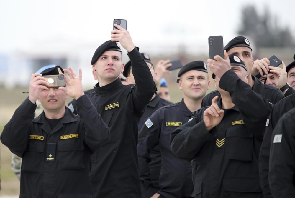 Albanian soldiers take photographs as Italian Eurofighters fly over, during an inaugurated ceremony at an airbase, in Kocuve, about 85 kilometers (52 miles) south of Tirana, Albania, Monday, March 4, 2024. NATO member Albania inaugurated an international tactic air base on Monday, the Alliance’s first one in the Western Balkan region. The air base situated in Kucove 85 kilometers (52 miles) south of Tirana, the capital, is named after the small town of Kuçove nearby. (AP Photo/Armando Babani)