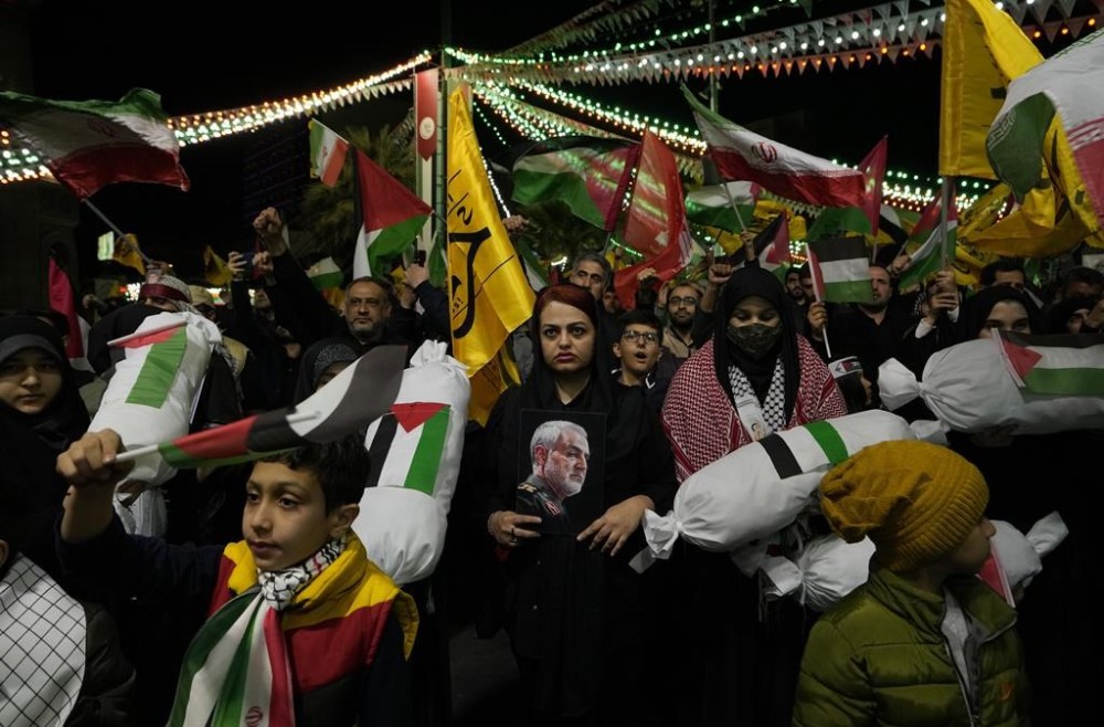 Iranian protesters wave Iranian and Palestinian flags and hold the symbolic shrouded bodies of the Palestinian children as one of them holds a poster of the late Iranian Revolutionary Guard Gen. Qassem Soleimani, who was killed in a U.S. drone attack in 2020, center, during their anti-Israeli gathering to condemn killing members of the Iranian Revolutionary Guard in Syria, at the Felestin (Palestine) Sq. in downtown Tehran, Iran, Monday, April 1, 2024. An Israeli airstrike that demolished Iran's consulate in Syria killed two Iranian generals and five officers, Syrian and Iranian officials said Monday. (AP Photo/Vahid Salemi)