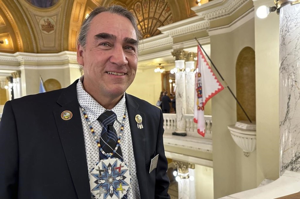 Democratic South Dakota Sen. Shawn Bordeaux stands inside the state Capitol, Feb. 21, 2024, in Pierre, S.D. The Rosebud Sioux Tribe's flag hangs in the background at right. Bordeaux has condemned comments by South Dakota Republican Gov. Kristi Noem that tribal leaders are