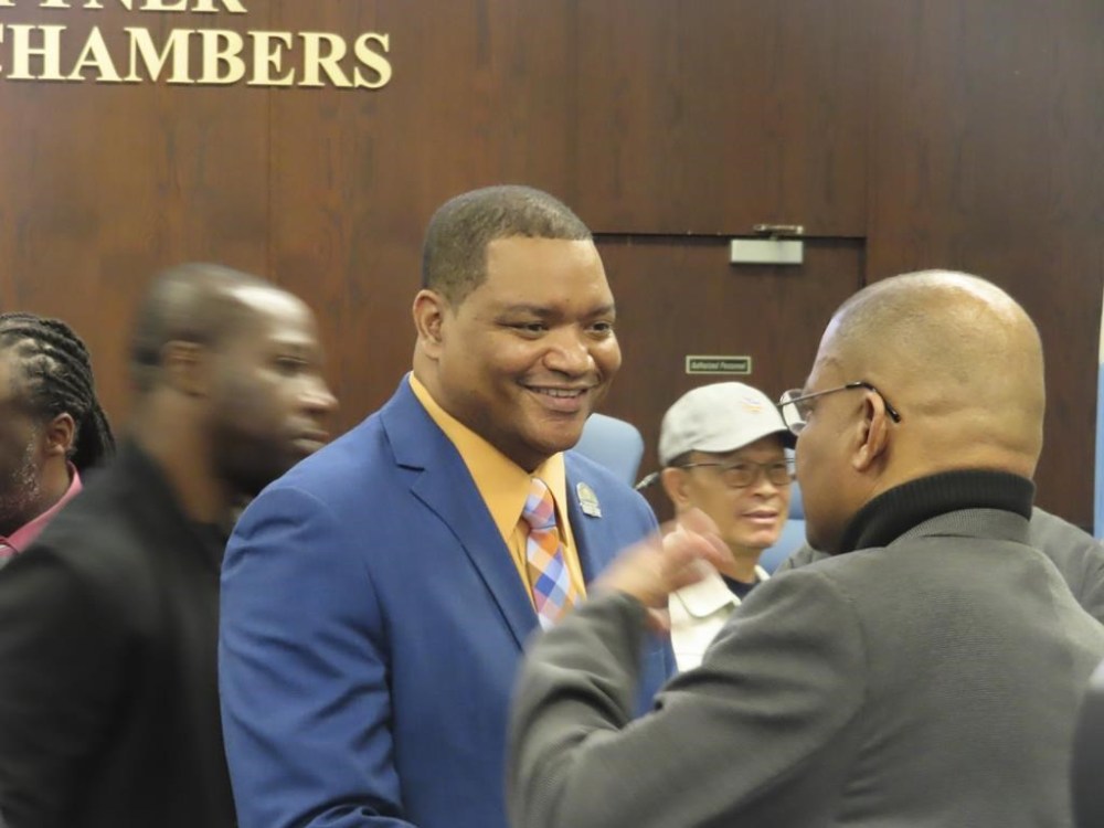 Atlantic City Mayor Marty Small, center, greets supporters after a news conference in Atlantic City, N.J., on April 1, 2024. Small said search warrants executed at his home last week by the county prosecutor's office involved "a family issue" for which the Smalls are in counseling and dealing with state child welfare authorities. On April 15, 2024, Small and his wife LaQuetta were charged with child endangerment and assault regarding their teenage daughter. (AP Photo/Wayne Parry)