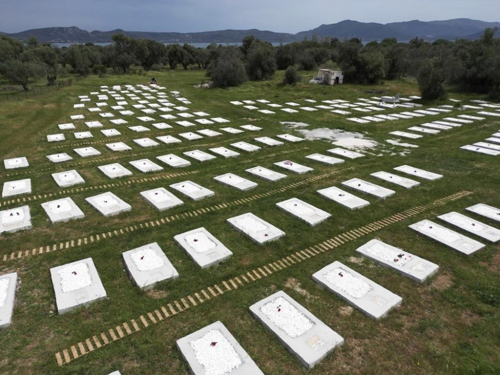 A cemetery is seen from above at Kato Tritos village on the northeastern Aegean Sea island of Lesbos, Greece, on Wednesday, April 17, 2024. After years of neglect, a primitive burial ground for refugees who died trying to reach Greece's island of Lesbos has been cleaned up and redesigned to provide a dignified resting place for the dead. (AP Photo/Panagiotis Balaskas)