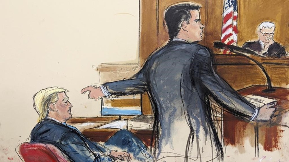 This artist depiction shows defense attorney Todd Blanche pointing at former President Donald Trump while giving his opening statement to the jury in Manhattan criminal court Monday, April 22, 2024, in New York. (Elizabeth Williams via AP)