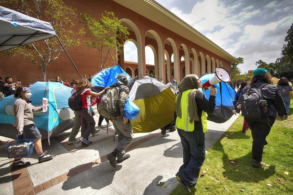 Police dragged students off by their hands and feet, snapping the poles holding up tents and zip-tying those who refused to disperse. Twenty arrests were made. The university says it is against code to camp overnight on school property, and the students were given several warnings to disperse before police were called in.
