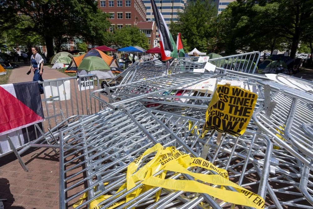 Before dawn Monday, demonstrators at the school in Washington, D.C., tore down metal barricades confining them to University Yard and set up more than a dozen tents in the middle of a street.
