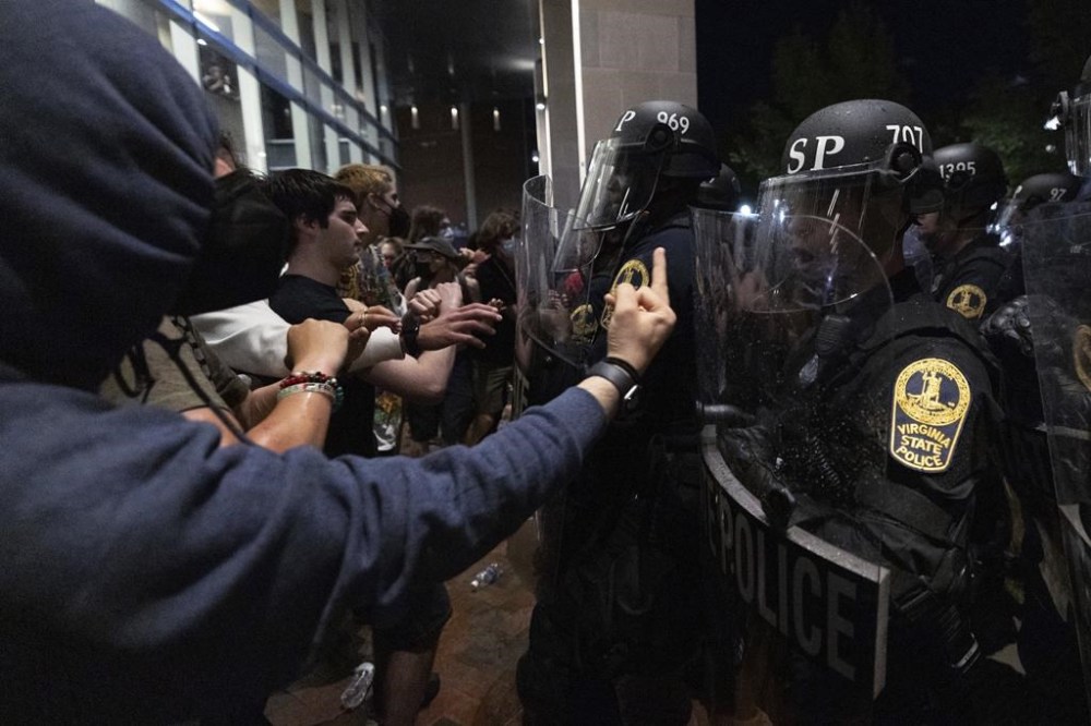 Protesters put up tents and built a barricade with shipping pallets. Police, some wearing riot gear, charged the line of demonstrators to clear the crowd, the Richmond Times-Dispatch reported. Some protesters were seen hurling water bottles and other objects at police.