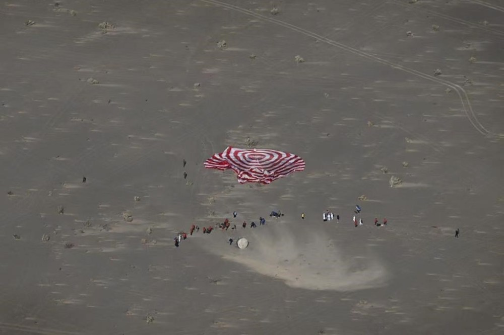 The Shenzhou-17 craft carrying Tang Hongbo, Tang Shengjie and Jiang Xinlin landed at the Dongfeng site in north China’s Inner Mongolia Autonomous Region in the Gobi Desert shortly before 6 p.m. It comes roughly four days after the Shenzhou-18 mission docked with the station with their three-member replacement crew.