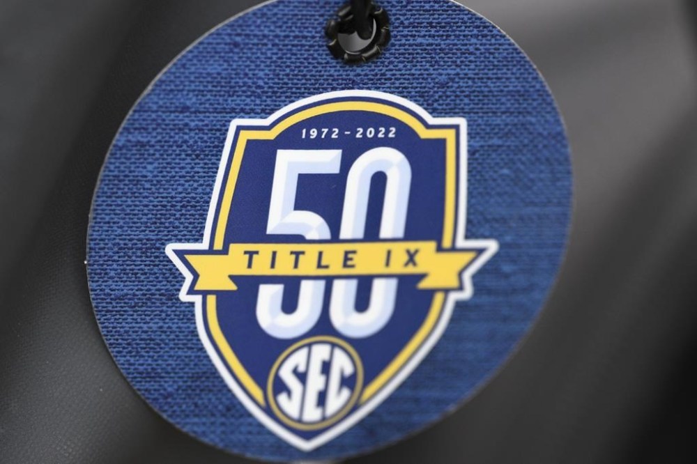 FILE - A luggage tag with a Southeastern Conference Title IX logo is viewed during an NCAA college softball game between South Carolina and Kennesaw State, March 1, 2024, in Orlando, Fla. Republican states are filing a barrage of legal challenges against the Biden administration's newly expanded campus sexual assault rules, saying they overstep the president's authority and undermine the Title IX anti-discrimination law. (AP Photo/Phelan M. Ebenhack, File)