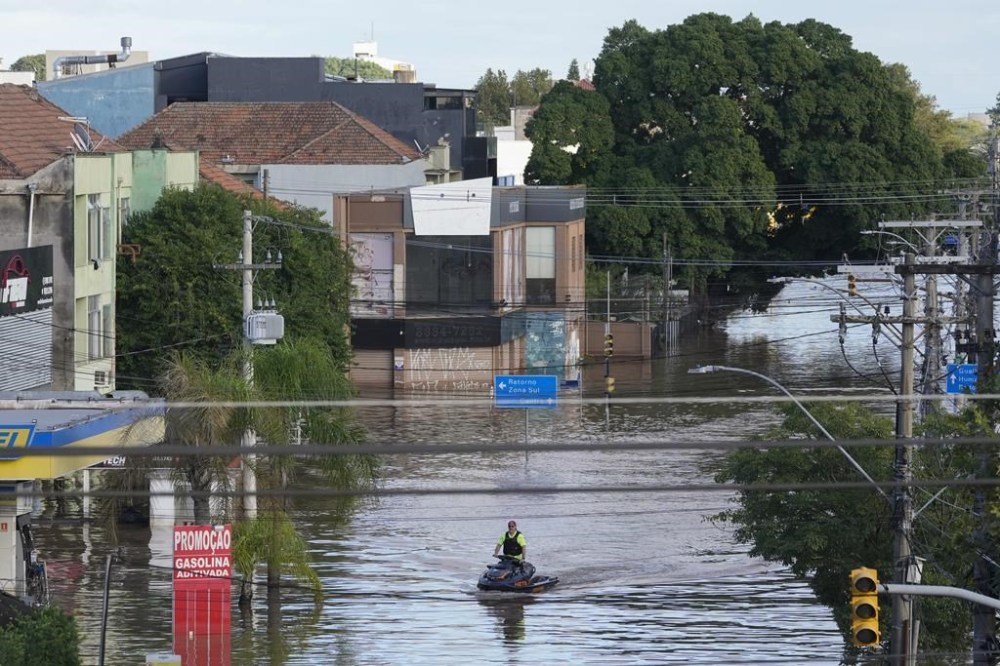 A man rides a jet ski on a flooded street after heavy rain in Porto Alegre, Rio Grande do Sul state, Brazil, Thursday, May 9, 2024. (AP Photo/Andre Penner)