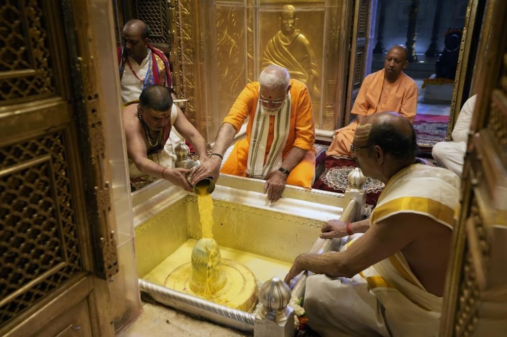 Indian Prime Minister Narendra Modi, center, performs rituals at Kashi Vishwanath Temple as Yogi Adityanath, Chief Minister of Uttar Pradesh sits behind him after a roadshow in Varanasi, India, Monday, May 13, 2024. (AP Photo/Rajesh Kumar)