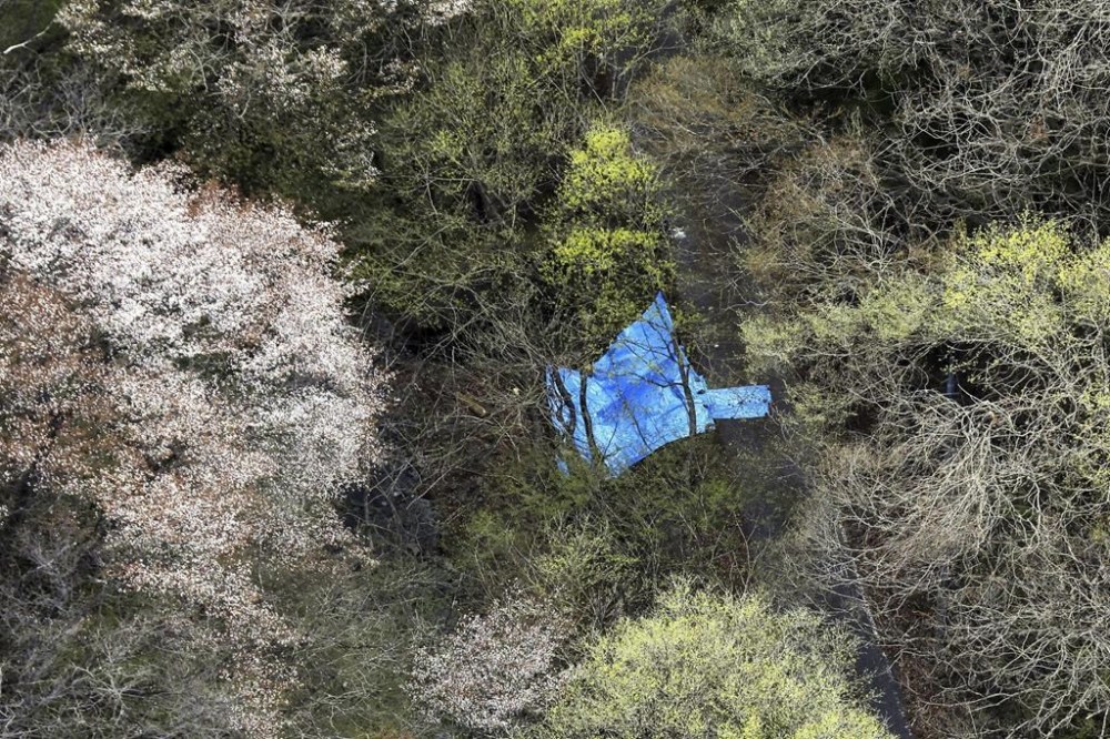 A plastic sheet covers the site where the dead bodies of an older couple were found in Nasu town, Tochigi prefecture, northeast of Tokyo, April 16, 2024. The Tokyo metropolitan police are currently investigating six suspects in their 20s and 30s, most of them without connections to one another, who are believed to have been hired on social media to kill, transport and burn the bodies. (Kyodo News via AP)