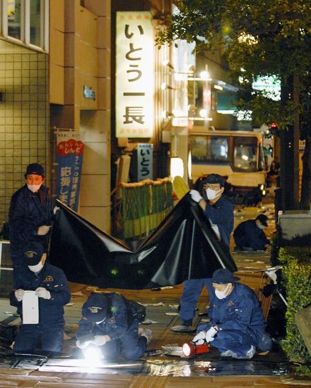 FILE - Police officers investigate at the site where Nagasaki Mayor Iccho Ito was assassinated by gunshot, in Nagasaki, southern Japan, April 17, 2007. Gang violence in a number of neighborhoods, including the 2007 fatal shooting of Ito during his election campaign, have since led the government to tighten gun control, racketeering laws and other anti-gang measures. (Kyodo News via AP, File)