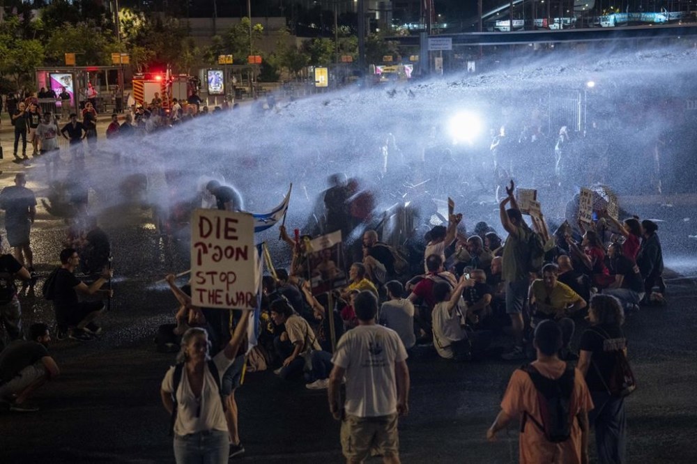 Police use water cannon to disperse demonstrators during a protest against Israeli Prime Minister Benjamin Netanyahu's government, and calling for the release of hostages held in the Gaza Strip by the Hamas militant group, in Tel Aviv, Israel, Saturday, May 25, 2024. (AP Photo/Ariel Schalit)