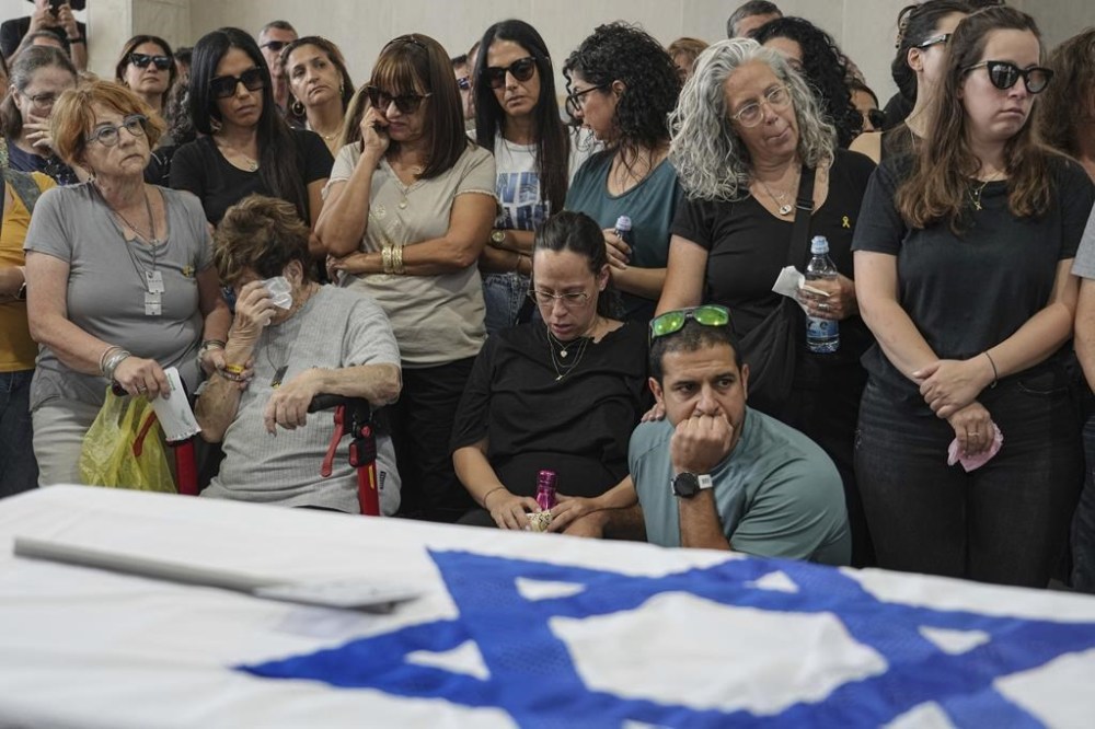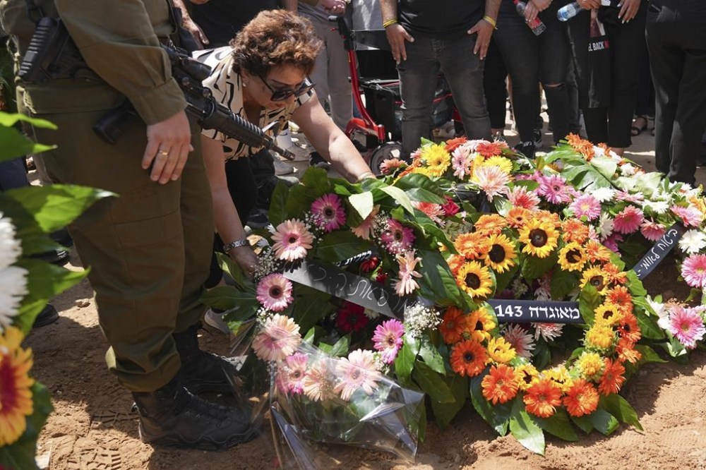 Mourners attend the funeral of Michel Nisenbaum, who was killed during Hamas' Oct. 7 attack and whose body was taken into Gaza, in Ashkelon, Israel, on Sunday, May 26, 2024. The Israeli military recovered Nisenbaum's remains, along with those of two other Israelis killed during the attack, in an operation in Gaza last week. (AP Photo/Tsafrir Abayov)