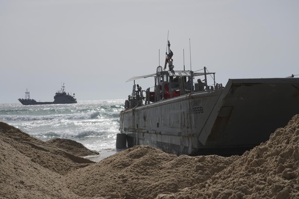 A washed up US Army vessel and a strip of docking area stranded off the coast near Ashdod, Israel, Saturday, May 25, 2024. A small US military boat and what appeared to be a strip of docking area washed up on a beach near the southern Israeli city of Ashdod. (AP Photo/Tsafrir Abayov)