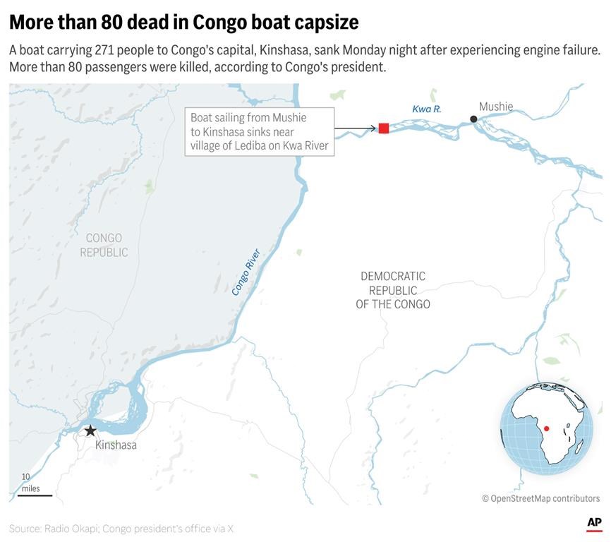 KINSHASA, Congo (AP) — A boat carrying more than 270 passengers has capsized on a river near Congo’s capital of Kinshasa, leaving more than 80 dead, President Félix Tshisekedi said Wednesday.