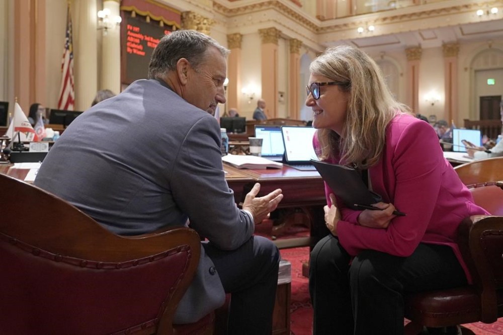 Republican state Sen. Brian Dahle, left, and Democratic Assemblymember Buffy Wicks, discuss a measure as the Legislature voted on the state budget bills at the Capitol in Sacramento, Calif., Wednesday, June 26, ,2024. Lawmakers passed the budget bills that closed a multi-billion dollar deficit and sent it to the governor. (AP Photo/Rich Pedroncelli)