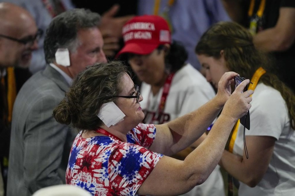 Trump, again wearing a bandage over his injured ear, watched Vance speak from his family box and was often seen smiling.