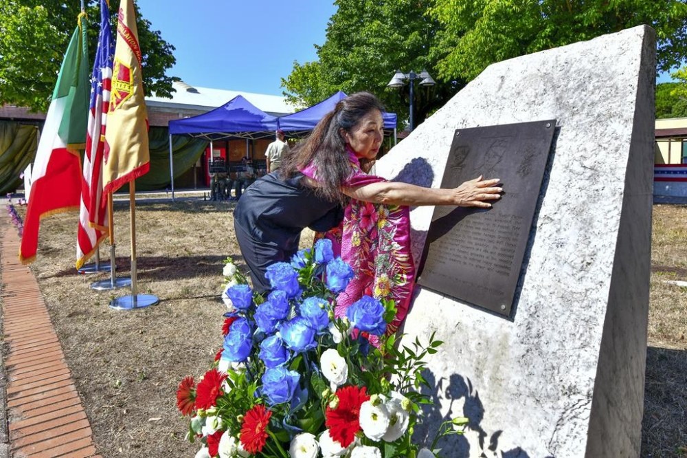 Valerie Matsunaga, whose father fought in the 442nd Infantry Regiment during the World War II, attends a commemoration at the U.S. military base of Camp Darby, Tuscany, central Italy, Thursday, July 11, 2024. The 442nd Infantry Regiment, known as the Nisei Regiment, was composed almost entirely of second-generation American soldiers of Japanese ancestry, who fought primarily in Europe, particularly in Italy, southern France and Germany.(U.S. Army photo by Elena Baladelli via AP)