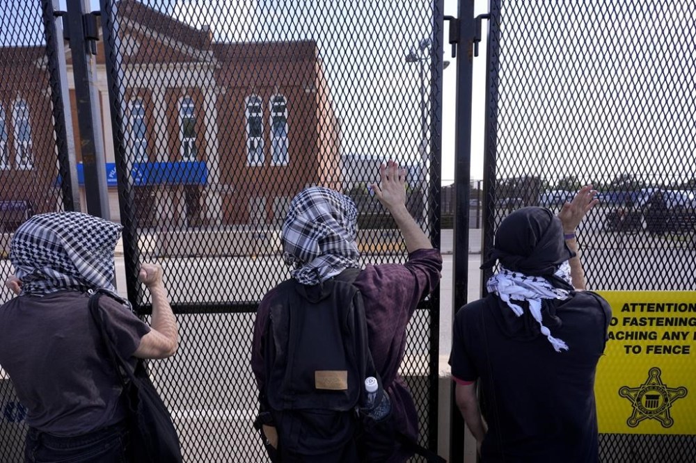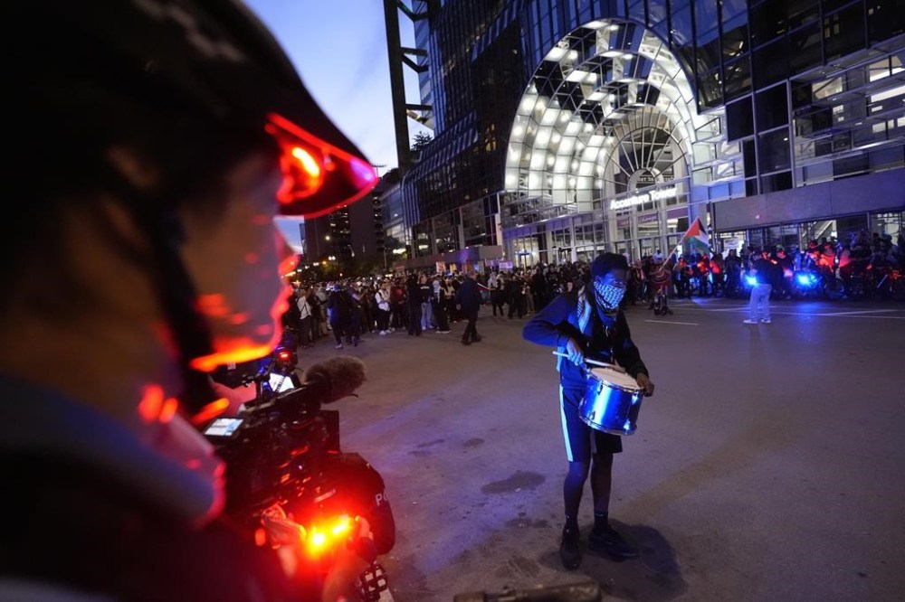 The atmosphere with rows of police in riot gear was a stark contrast to a day earlier when thousands of pro-Palestinian activists, including families pushing babies in strollers, marched near the convention site calling for a ceasefire.