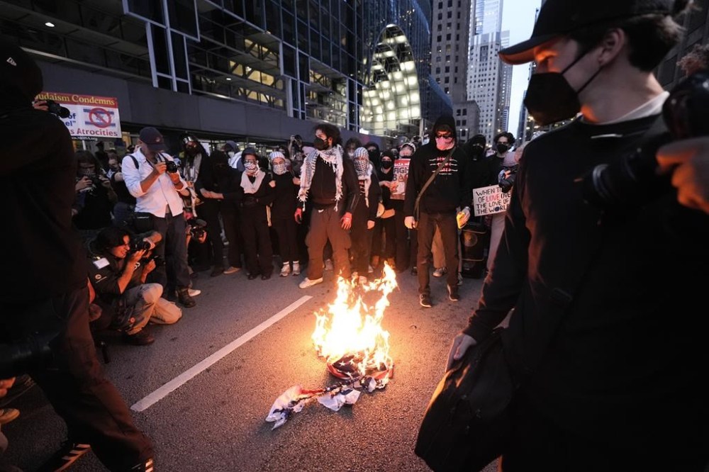 Earlier in the evening, some demonstrators set an American flag on fire in the street as the celebratory roll call for Vice President Kamala Harris took place inside the United Center about 2 miles (3.2 kilometers) away.
